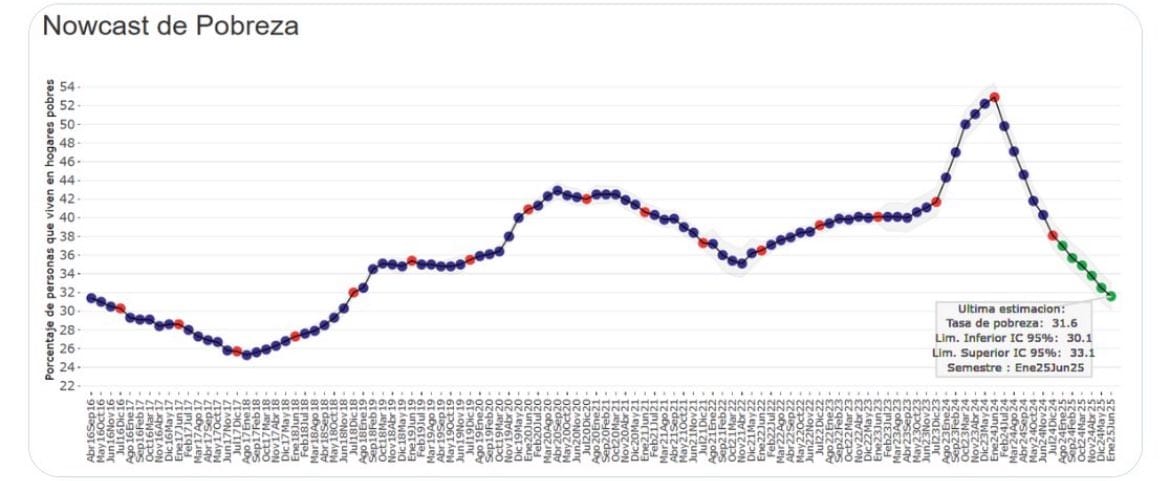 Questo grafico descrive la percentuale di persone con un reddito inferiori alla soglia di povertà, calcolata come un paniere di beni e servizi essenziali. I sussidi rientrano tra i redditi delle famiglie e possono o meno far superare la soglia. Si noti che Milei è stato eletto nel Dicembre del 2023 (inflazione al 223% - ora del 33%). La discesa del livello di povertà di 20 punti in un anno, -9 mln di poveri, è notevole: il tasso di povertà è il più basso dal 2018 (durante il precedente governo peronista è sempre stato più alto). Ora la discesa sta rallentando: incidere sul 25/30% di povertà strutturale sarà molto più difficile.