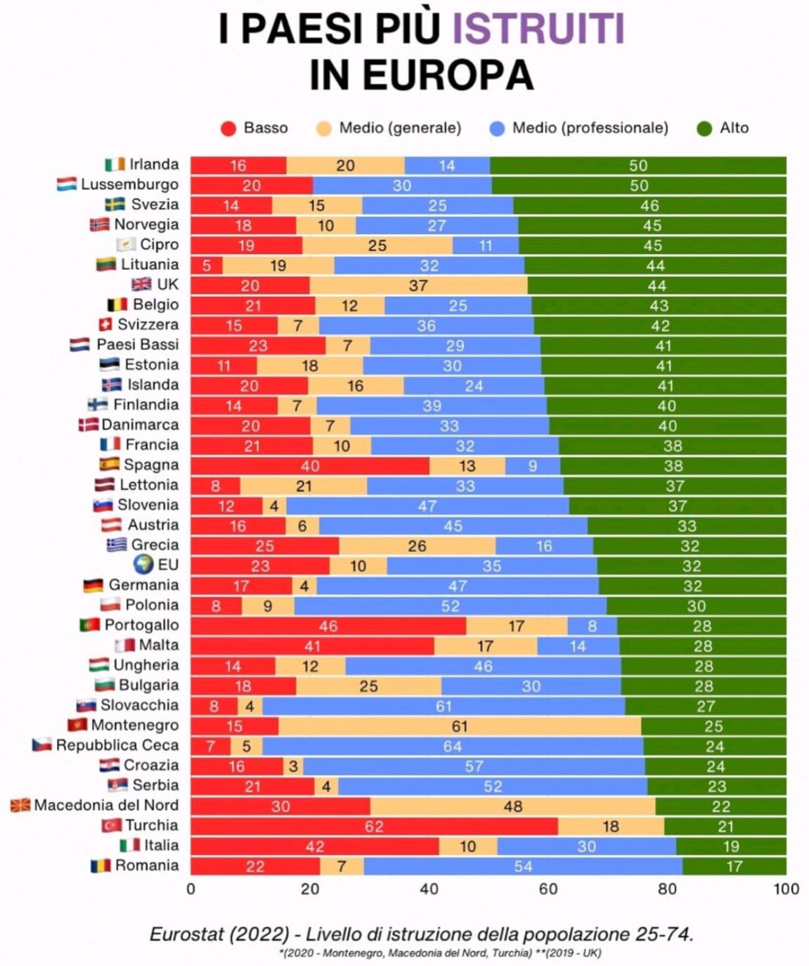 Italia sotto la Macedonia del Nord - non so come sia possibile, son stato in Macedonia, difficilmente diventerà mai una centro culturale. Si noti che quando si parla dell'impatto del livello di Istruzione nell'economia di un paese non si parla solo "numero di persone che arrivano all'Università", ma anche delle persone laureate che smettono di studiare, leggere e approfondire, in quanto chi ha più impatto sono comunque i singoli.